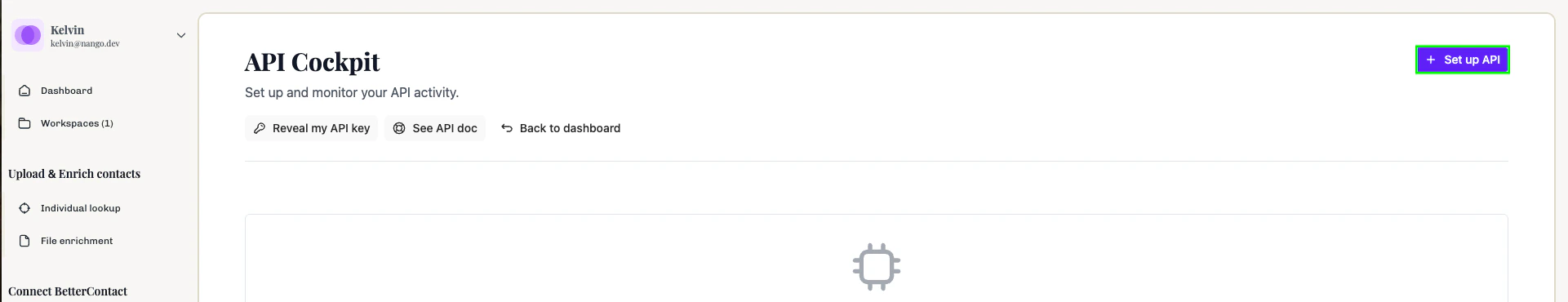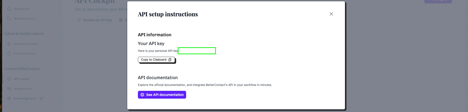 1. Log in to your BetterContact account and navigate to the API Cockpit page.