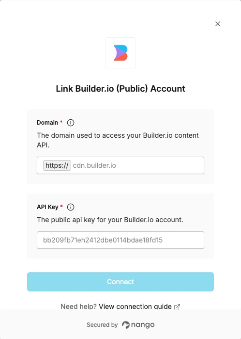 To authenticate with Builder.io (Public), you will need:- API Key – A public key that grants Nango permission to use Builder.io’s Content API.