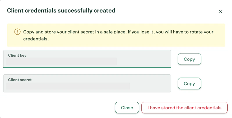 - Submit the form. You will be able to see your client credentials (Client ID and Client Secret).