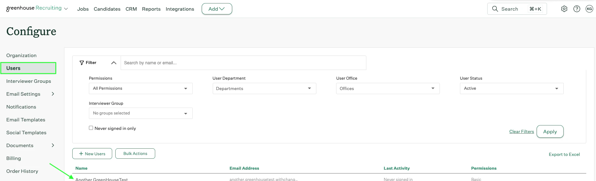 https://app.greenhouse.io/account/users/12345, the User ID is 12345.