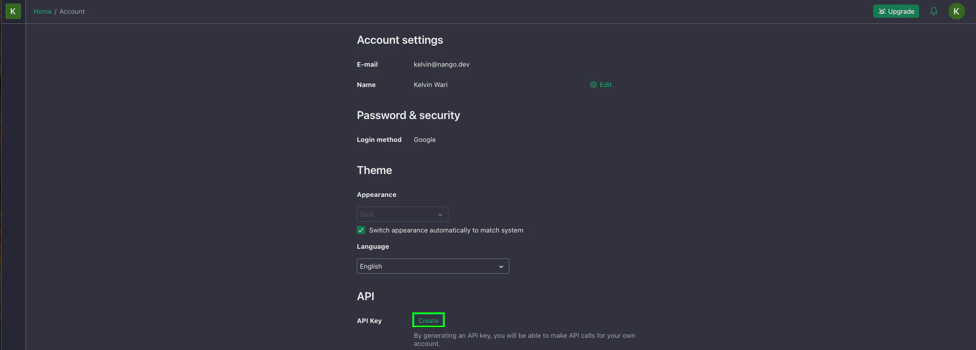 - If an API Key is not present, click the Create button. If an API key already exists, you can copy it.