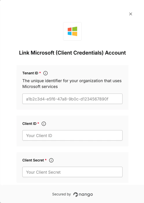 To connect Microsoft (Client Credentials) in Nango, you need to provide:- Tenant ID — The unique identifier for your organization that uses Microsoft services.