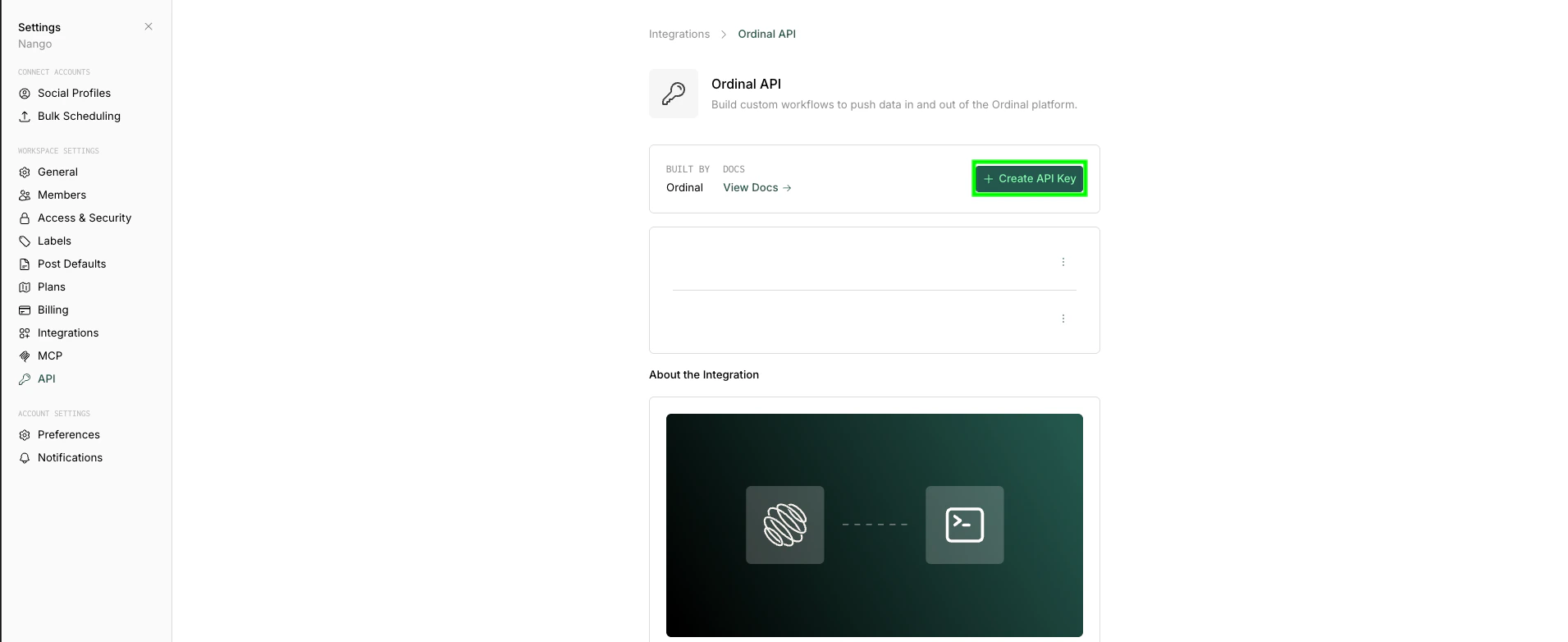- Log in to your Ordinal workspace and navigate to the Ordinal API page.