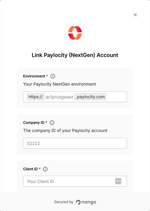 - Client Secret - A secret key used in conjunction with the Client ID to grant Nango permission to access Paylocity’s API resources and services.