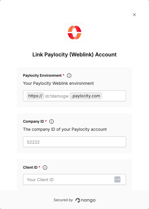 - Client Secret - A secret key used in conjunction with the Client ID to grant Nango permission to access Paylocity’s API resources and services.