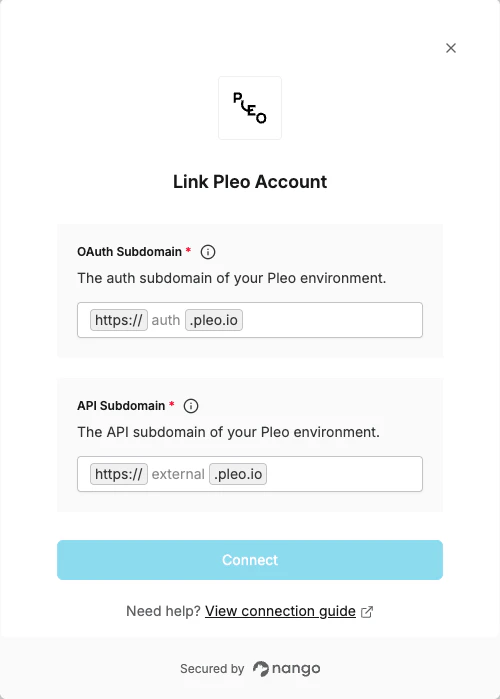 To authenticate with Pleo, you need:- OAuth Subdomain - The subdomain used for Pleo’s OAuth authorization flow.