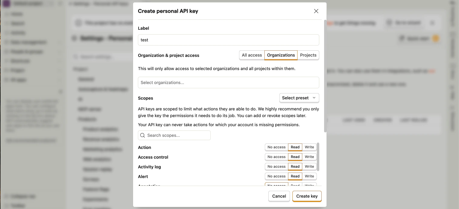 - Choose the scopes and access level for your key. We recommend selecting only the scopes and access level required for the API endpoints you really need. You can always modify the scopes later if you need to.