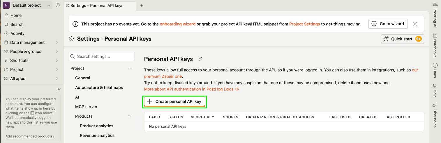 https://and before.posthog.com - API Key - A key that grants Nango permission to interact with PostHog’s APIs and services