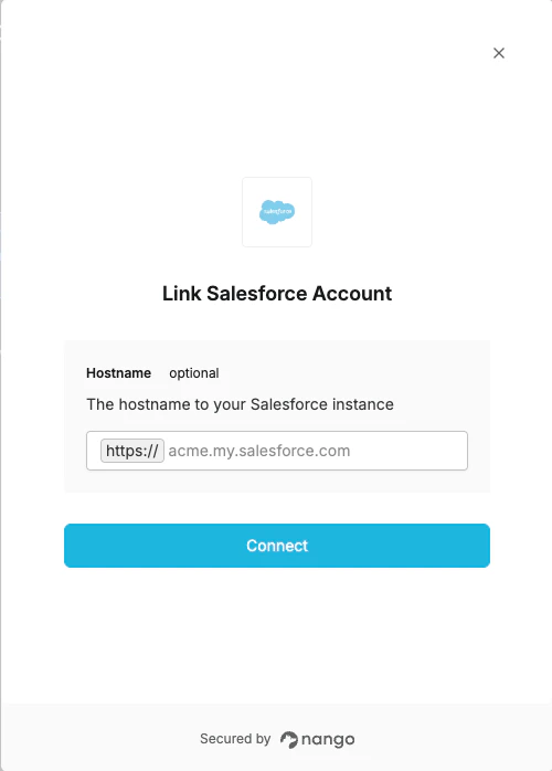 The hostname is optional. If not provided, Nango will use the default Salesforce login endpoint (