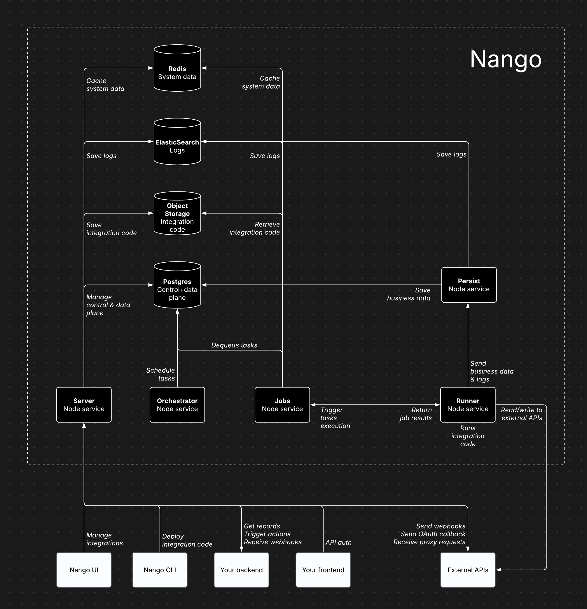Nango consists of several core services, each handling specific responsibilities:- Server (Node service): Powers the dashboard, API, proxy requests, and incoming/outgoing webhooks.
