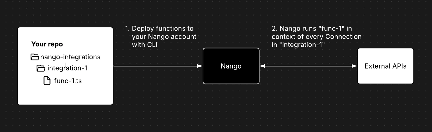 Functions are Nango’s TypeScript runtime for building custom integrations. You write integration logic in TypeScript and deploy it to Nango. Functions execute with built-in access to authenticated APIs, retries, storage, and observability. Functions are a flexible primitive that you can use to build any integration use-case, from simple API actions to complex data syncs, RAG pipelines & real-time webhook ingestion. Pair Functions with the AI integration builder to generate and maintain integration code faster: combine the speed of AI with human-reviewable code you fully control.