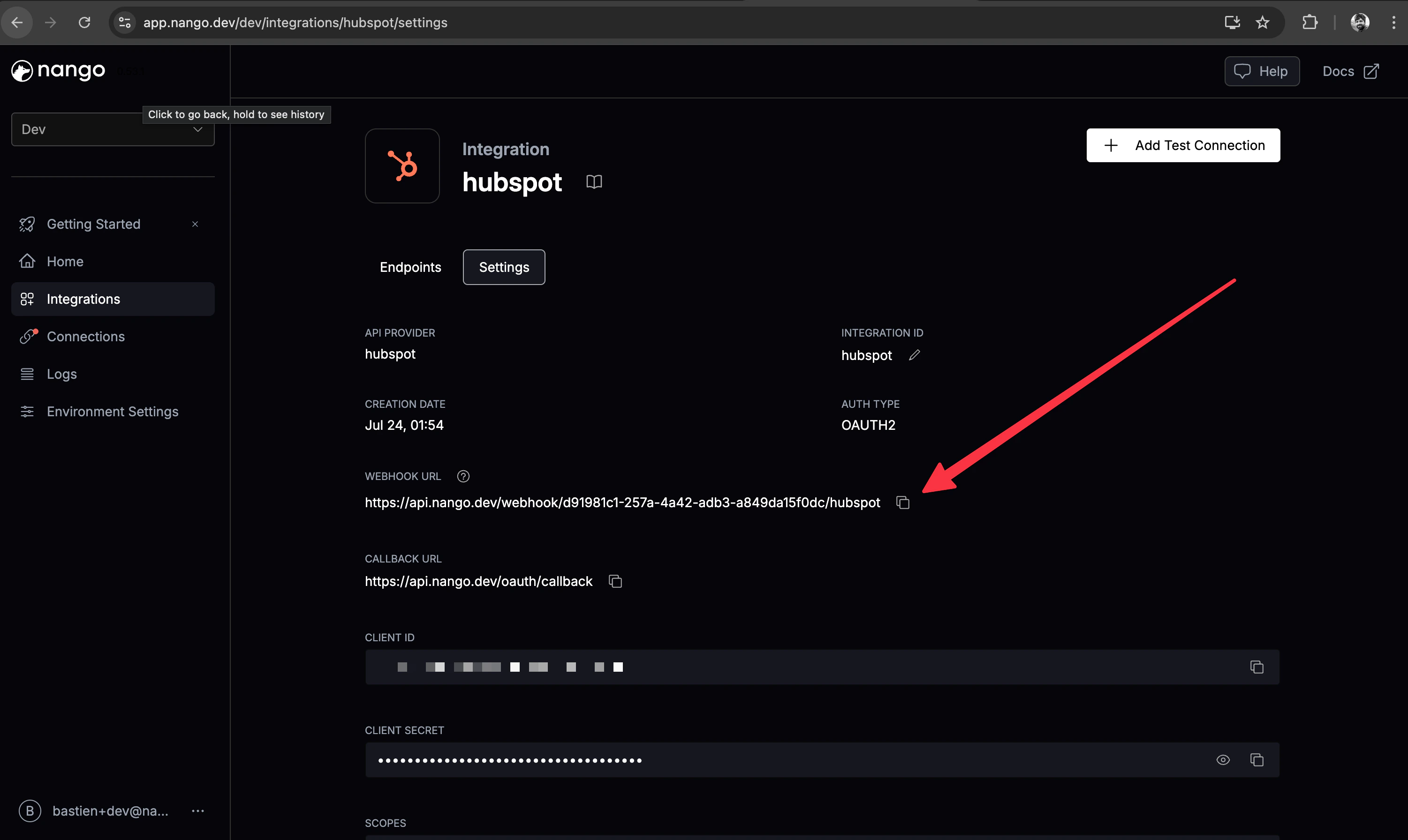 Most external APIs require you to register the URL for receiving webhooks in their developer portal. Provide the Nango URL to receive webhooks, which is accessible in your integration settings in the Nango UI (Integrations tab > pick an integration > Settings sub-tab).