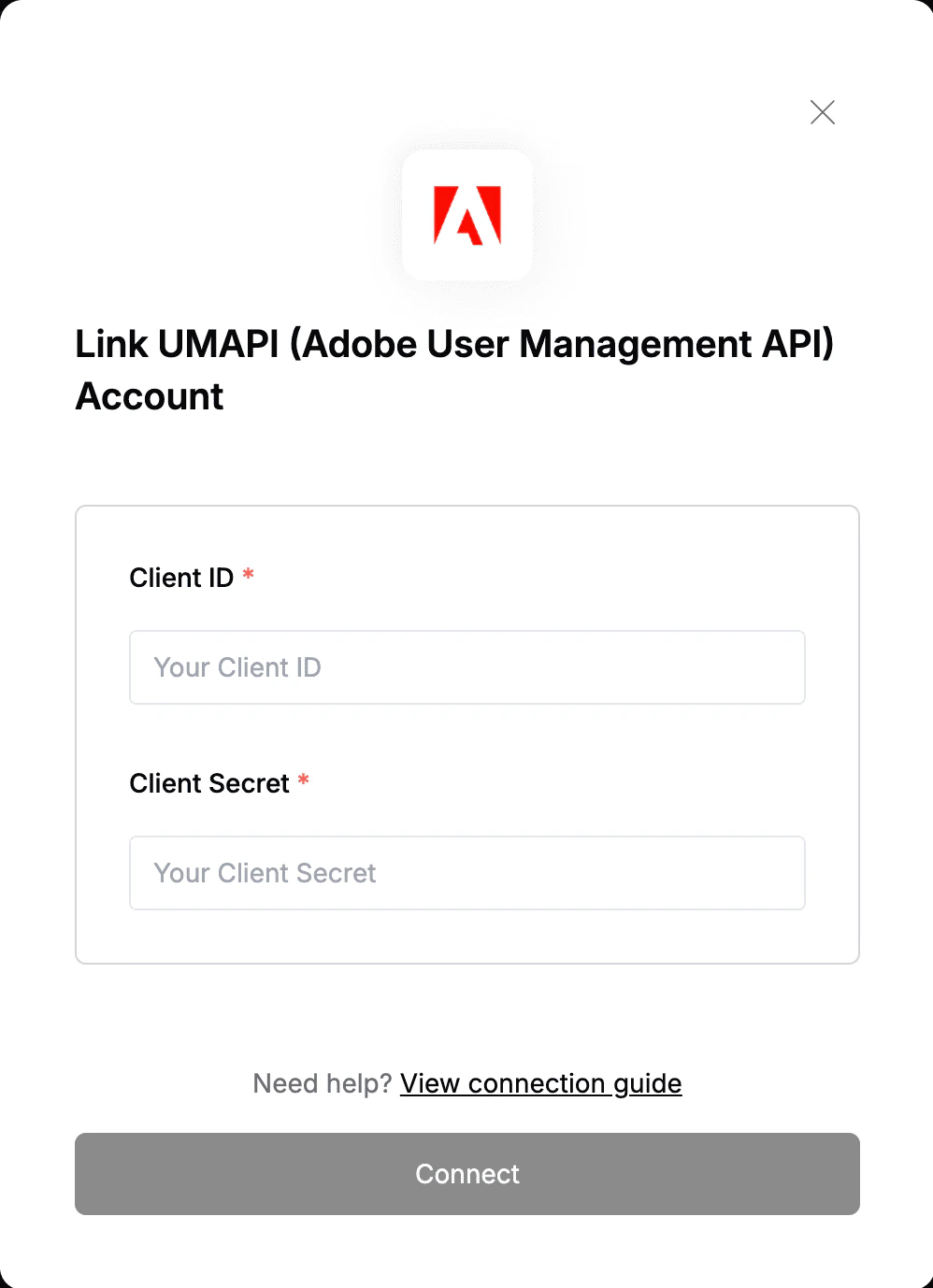 To authenticate with UMAPI (Adobe User Management API), you need:- Client ID - A unique identifier for your client.