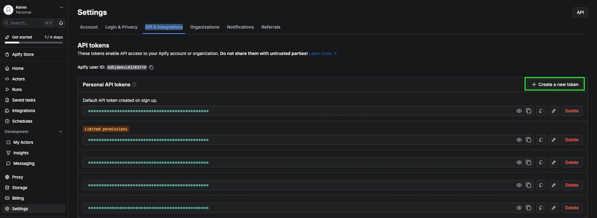 - Log in to your Apify account and navigate to API & Integrations.