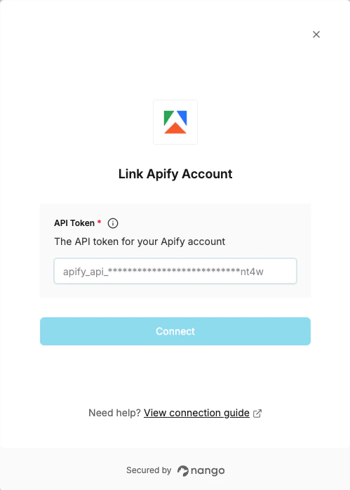 To authenticate with Apify, you need:- API Token - A token that grants Nango permission to interact with Apify’s API resources and services.