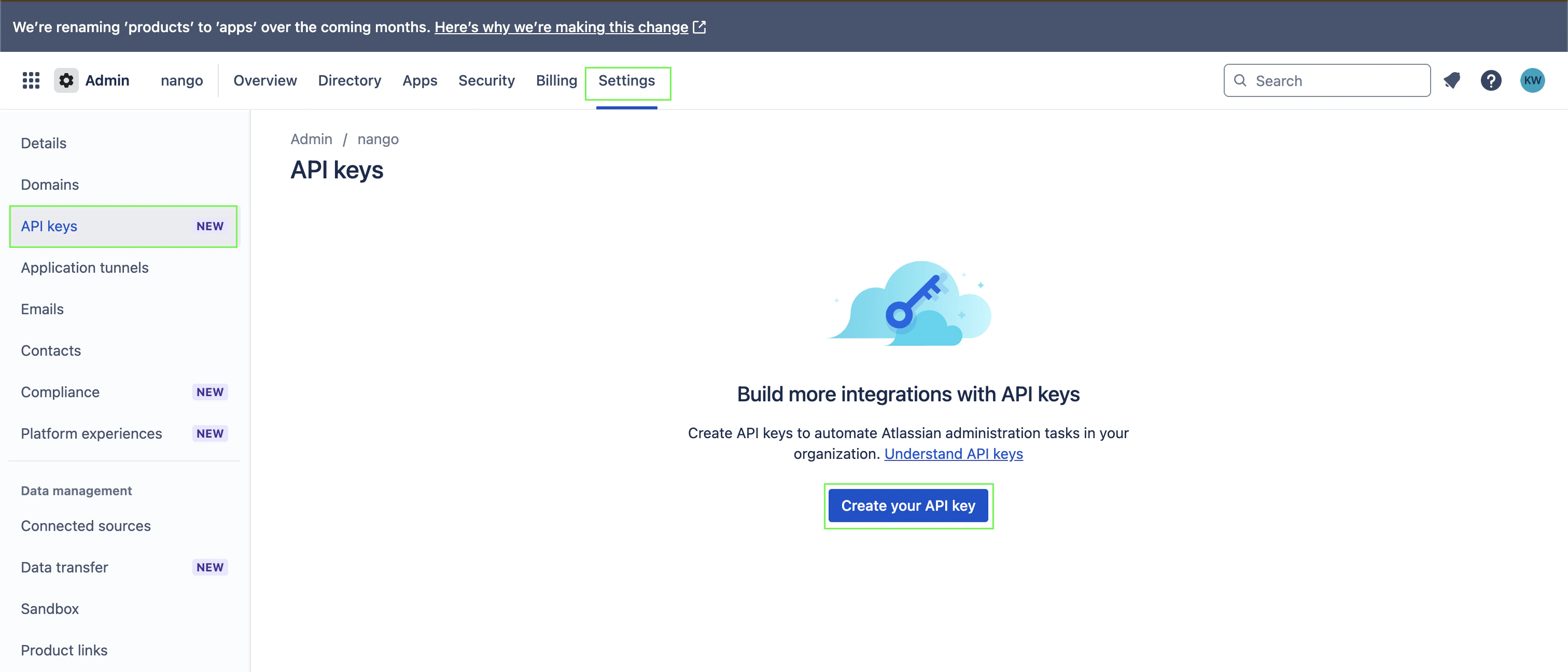 - To authenticate with Atlassian Cloud Admin APIs, you’ll need to generate an API key. You can choose between: