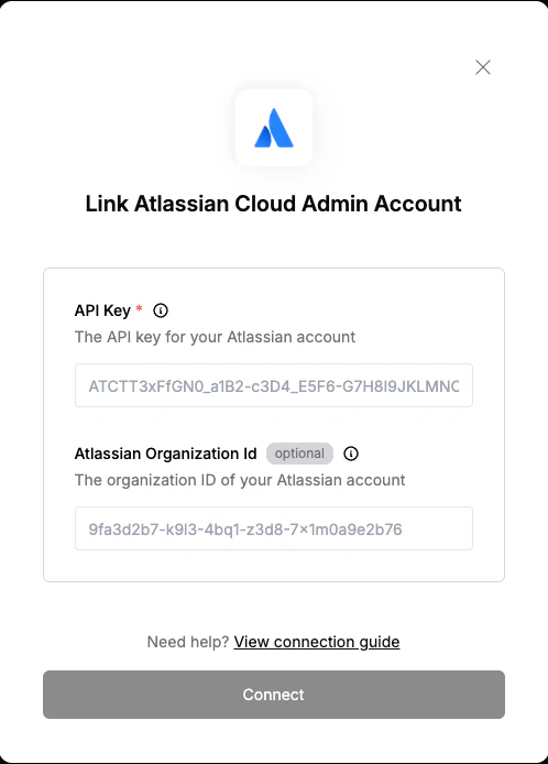 To authenticate with Atlassian Cloud Admin, you will need:- API Key - A key that grants Nango permission to interact with Atlassian Cloud Admin APIs resources and services.