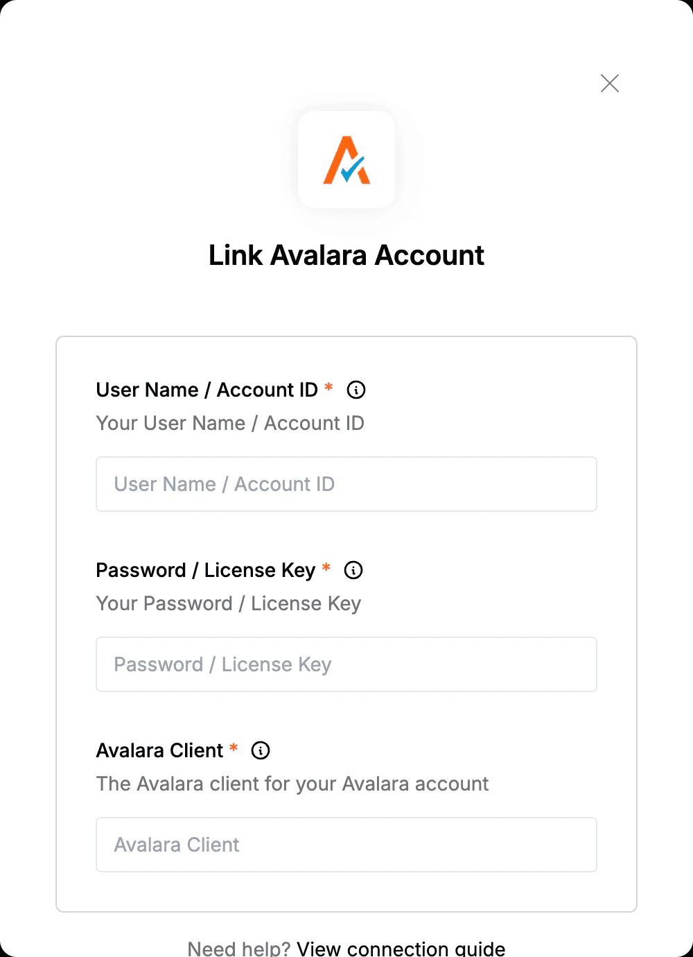 - You can use your username/password pair for authentication, or alternatively, opt for the Account ID/License Key pair. To obtain the later credentials, log in to your Avalara dashboard.