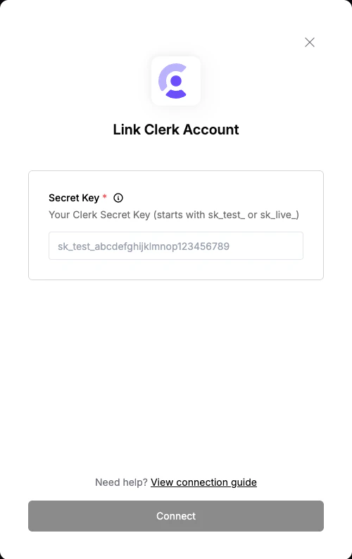 To authenticate with Clerk, you need:- Secret Key - A key that grants Nango permission to interact with Clerk’s APIs resources and services.