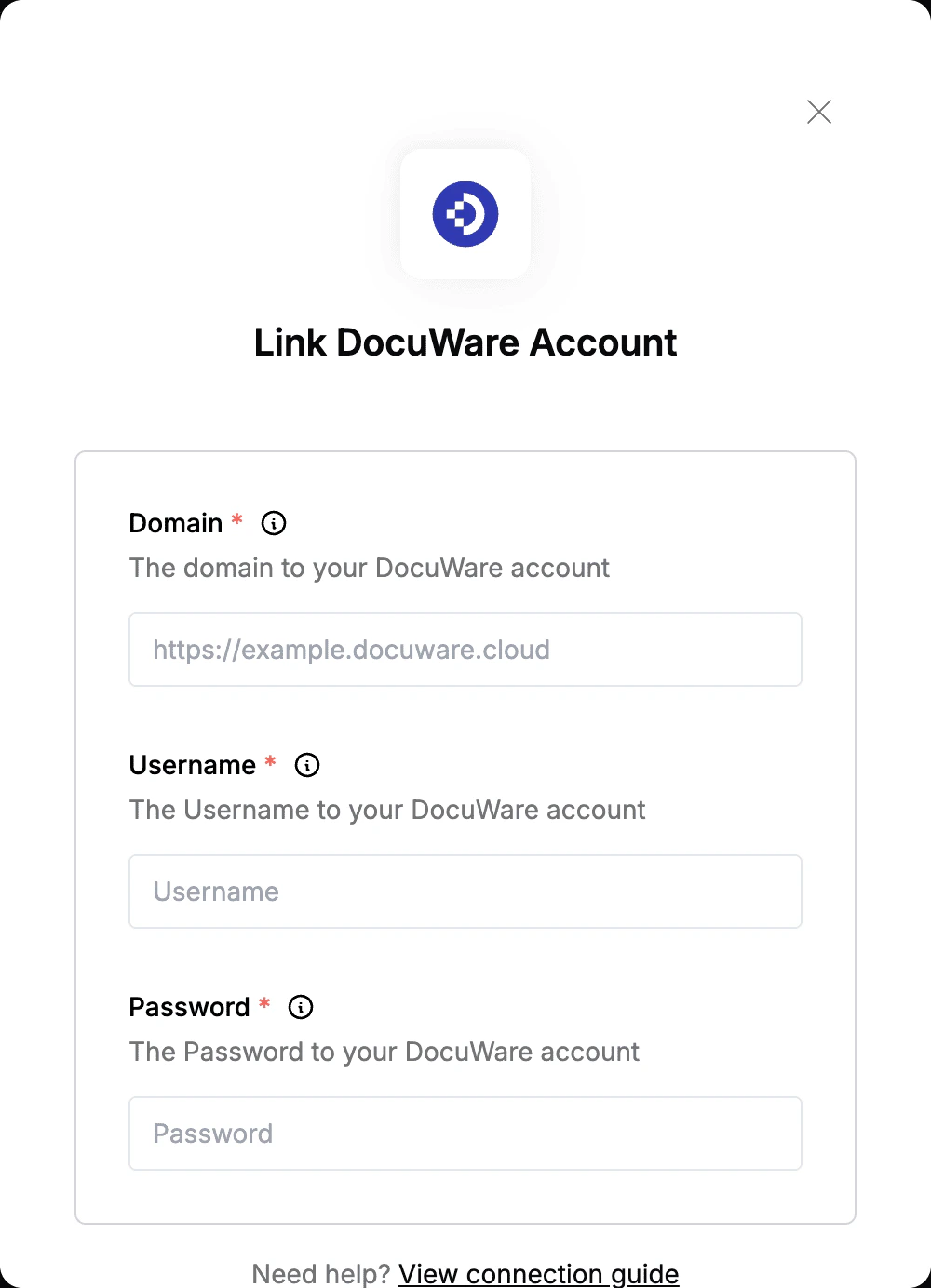 To authenticate with DocuWare, you will need:- Domain - The domain to your DocuWare account.