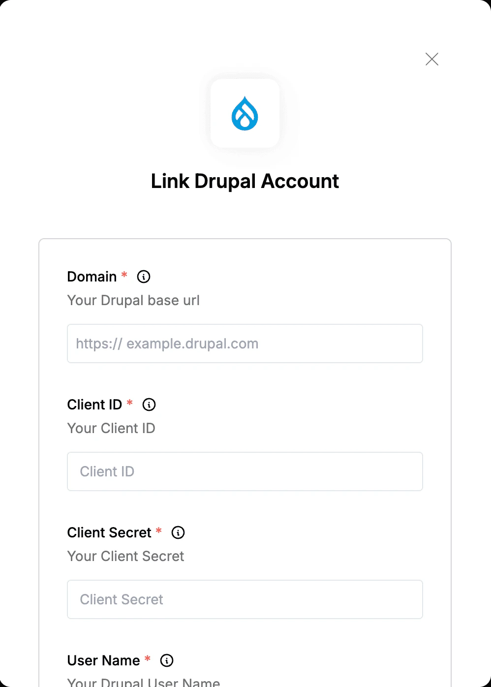 To authenticate with Drupal, you need:- Base Url - The base URL to your Drupal instance.