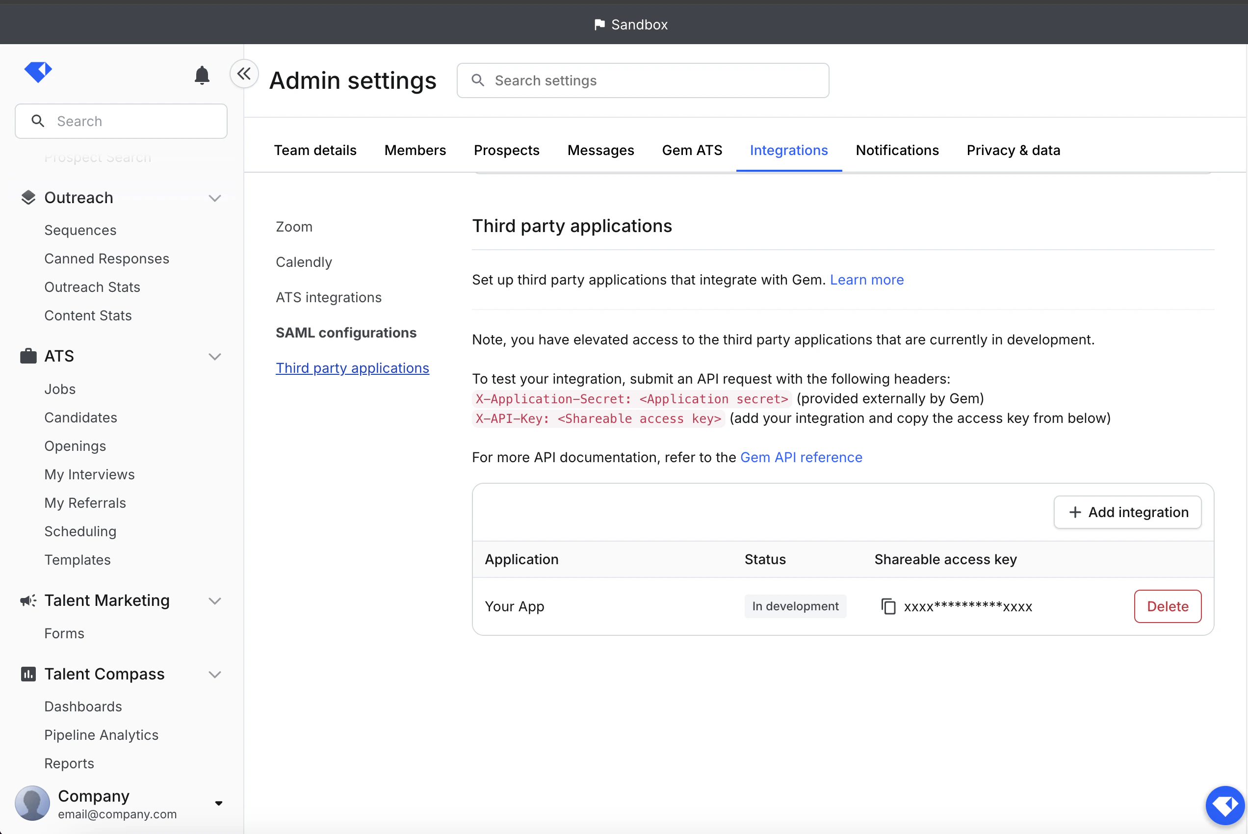 - The API must be enabled for your account before you can generate API keys. To request access, reach out to your Gem point of contact (Customer Success Manager or Account Executive).