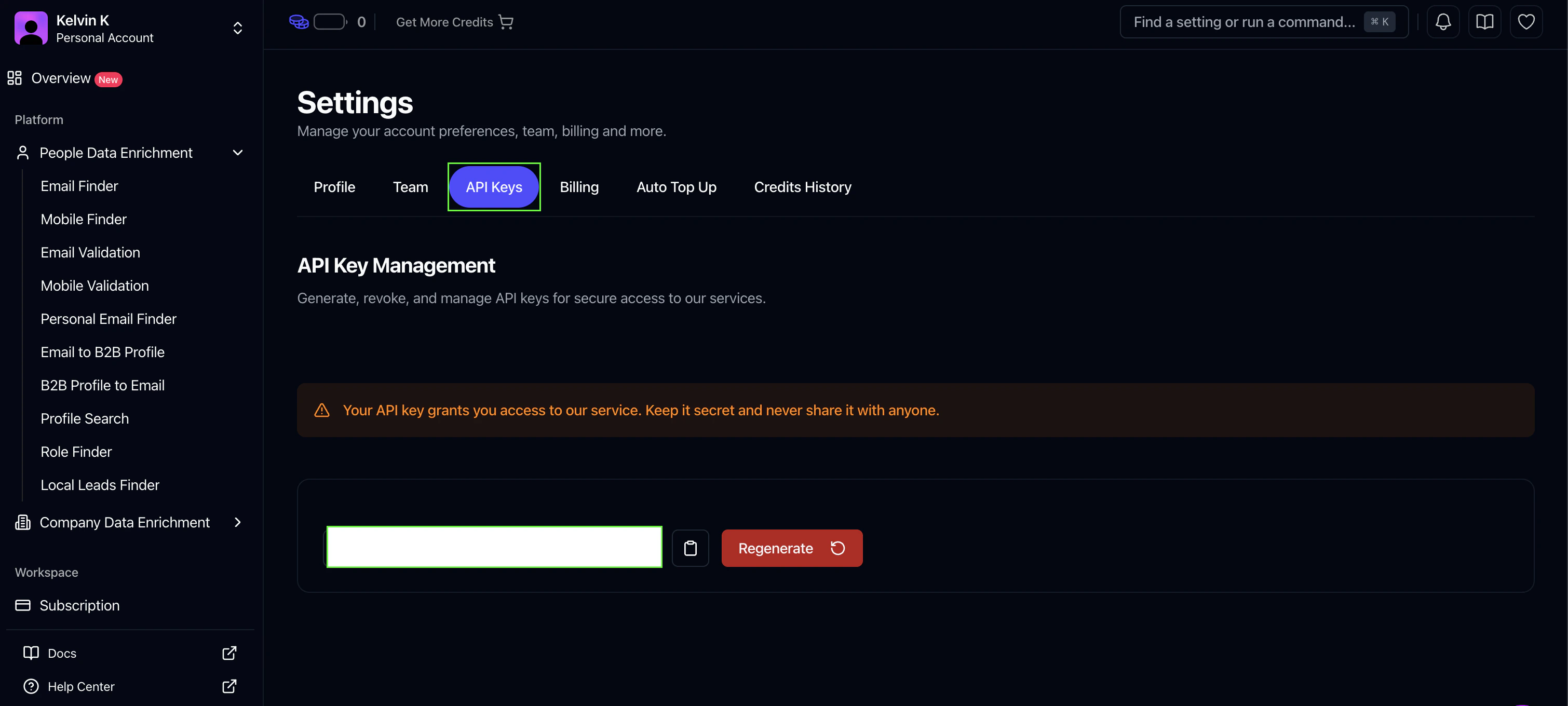 - Log in to your LeadMagic account and navigate to the API Key tab in the settings page.