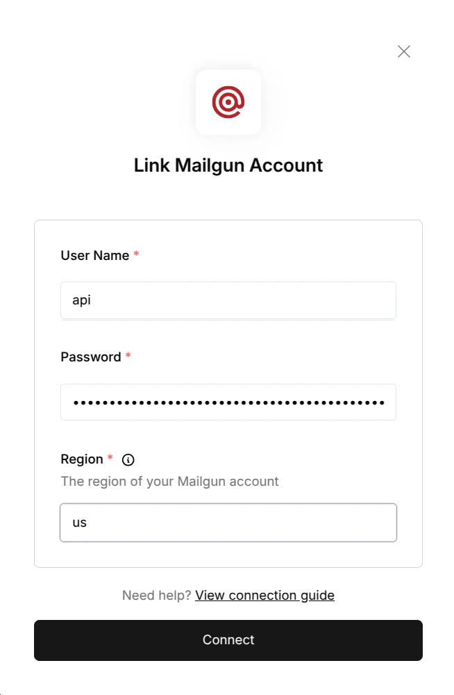 • Region: Ensure you enter the correct region for your Mailgun account to avoid connection issues.