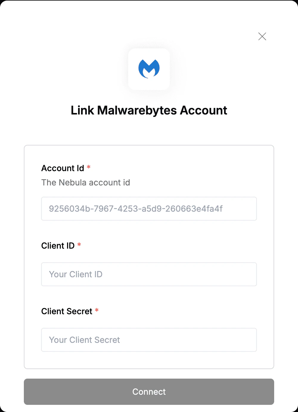 To authenticate with Malwarebytes, you need:- Account Id - This is a unique Id assigned to your Nebula account.