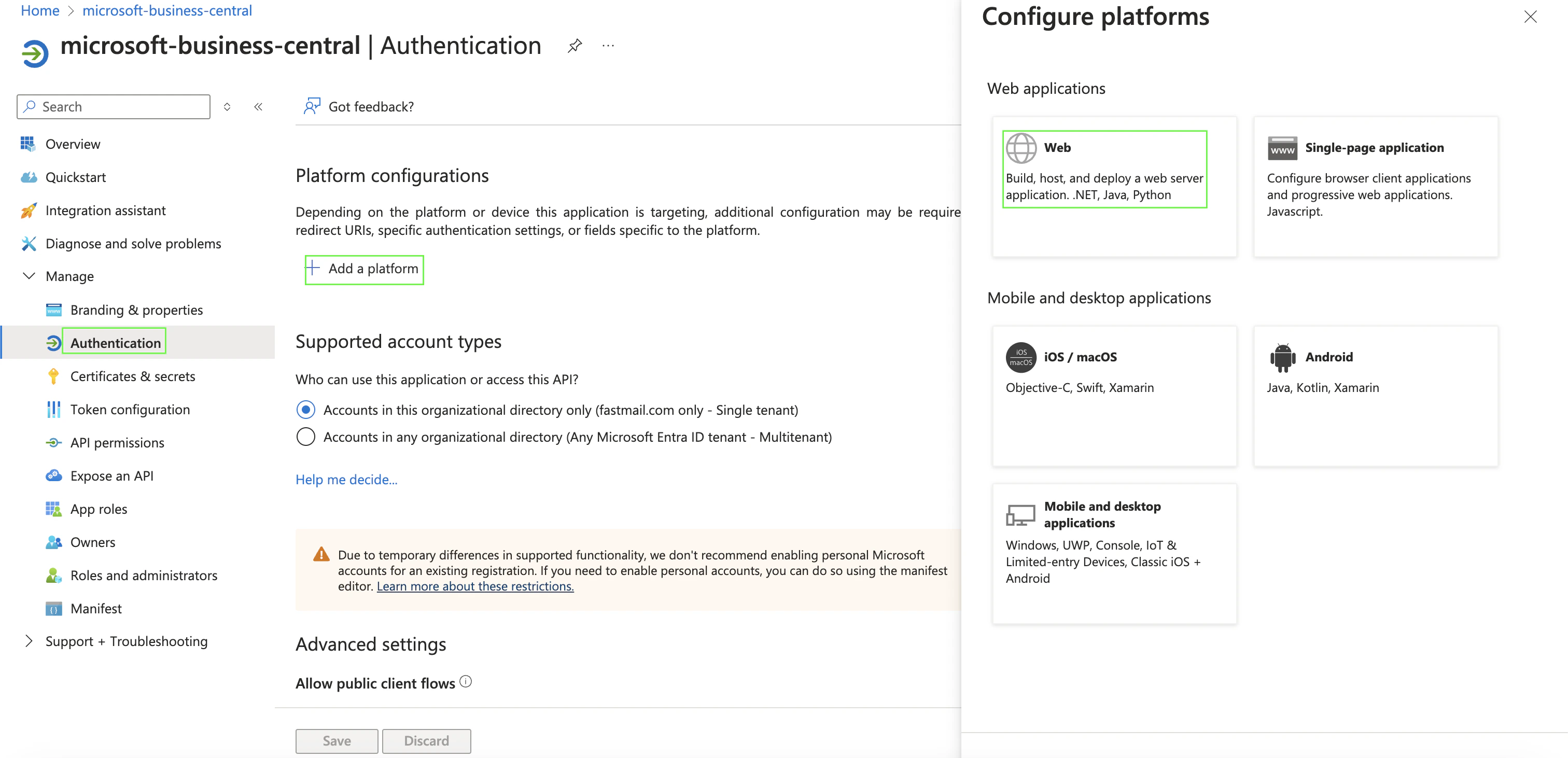 - After setting up the app above, we need to Configure service-to-service authentication for the Azure AD application in Business Central.
