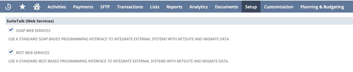 - Under the “SuiteTalk” header make sure the SOAP WEB SERVICES and REST WEB SERVICES checkboxes are checked