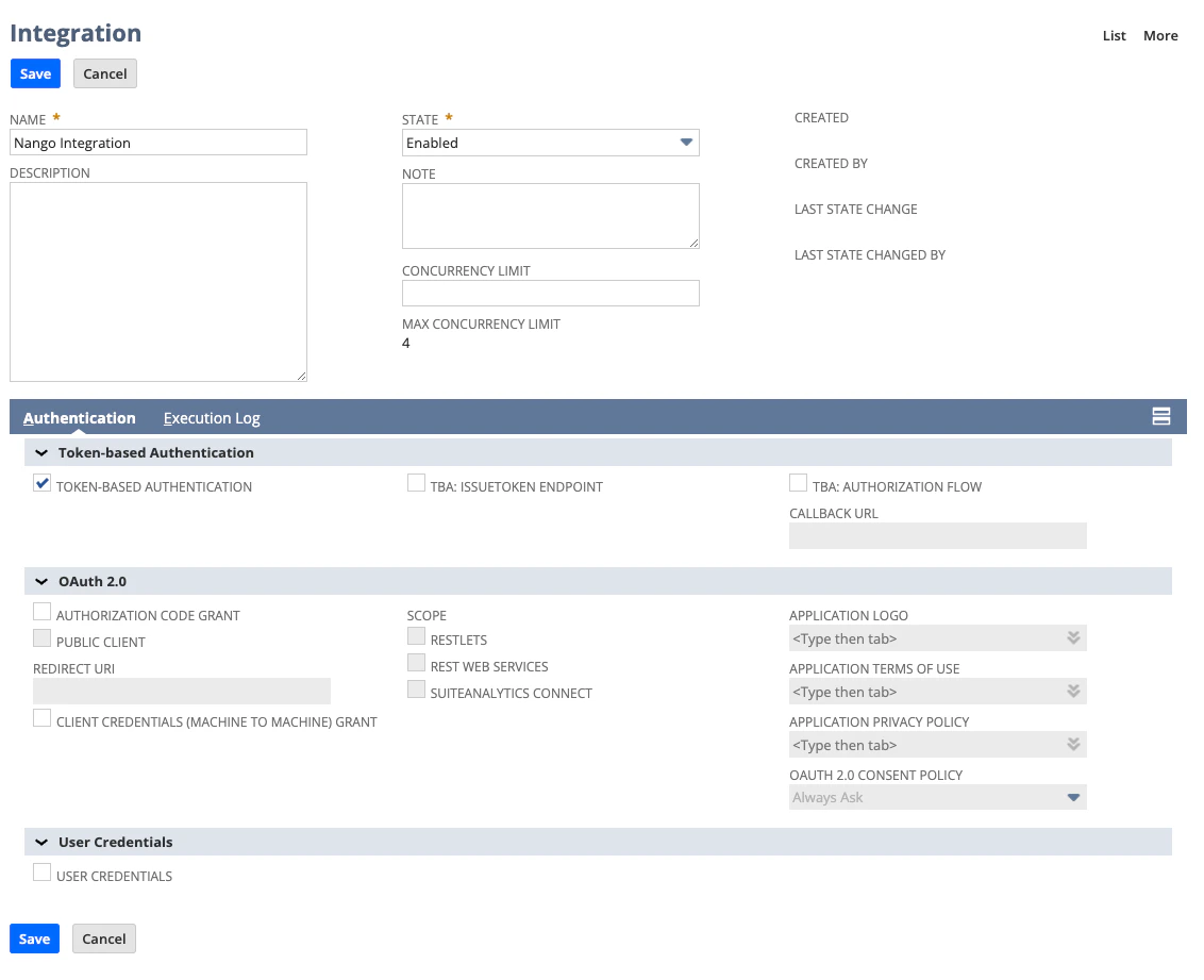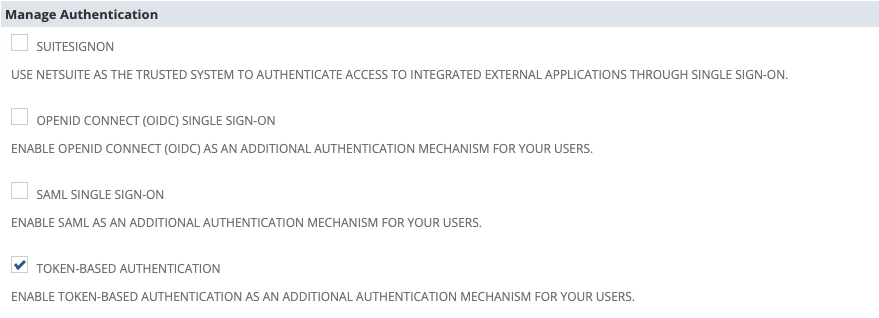- Enable TOKEN-BASED AUTHENTICATION and disable TBA: AUTHORIZATION FLOW and AUTHORIZATION CODE GRANT