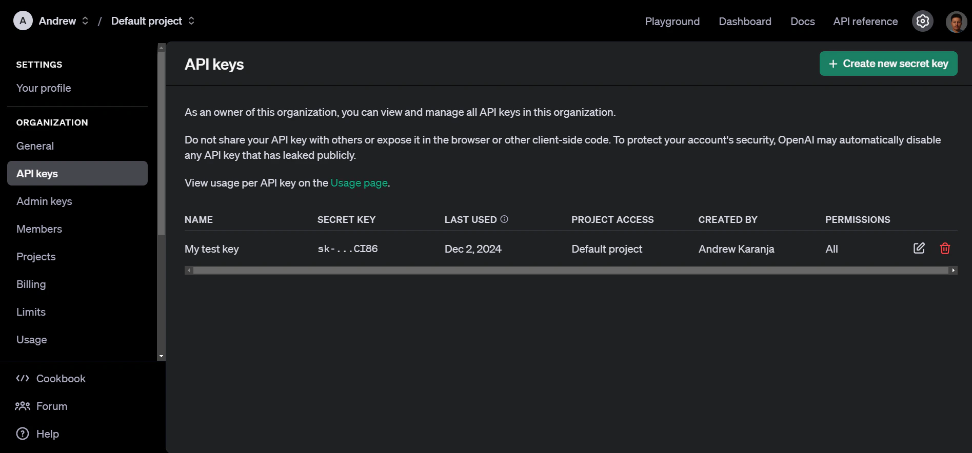 Click Create new secret key to generate a new API key.