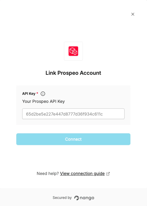 To authenticate with Prospeo, you will need:- API Key - A key that grants Nango permission to interact with Prospeo’s API resources and services.