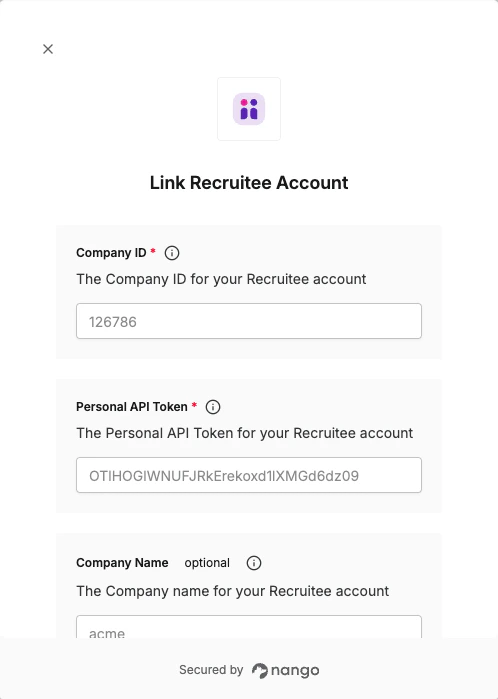 To authenticate with Recruitee, you need:- Personal API Token - A personal API token that grants Nango permission to interact with Recruitee’s ATS API.