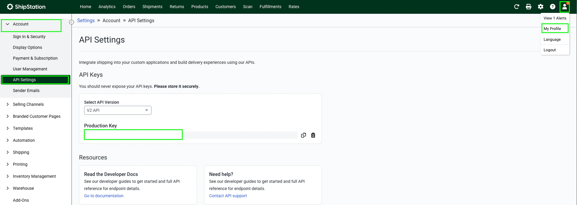 - Navigate to My Profile > Account > API Settings, then select V2 API from the Select API Version dropdown.
