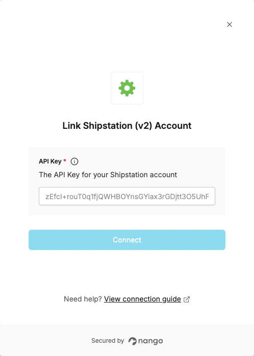 To authenticate with ShipStation (v2), you need:- API Key - A key that grants Nango permission to interact with ShipStation (v2) API resources and services.