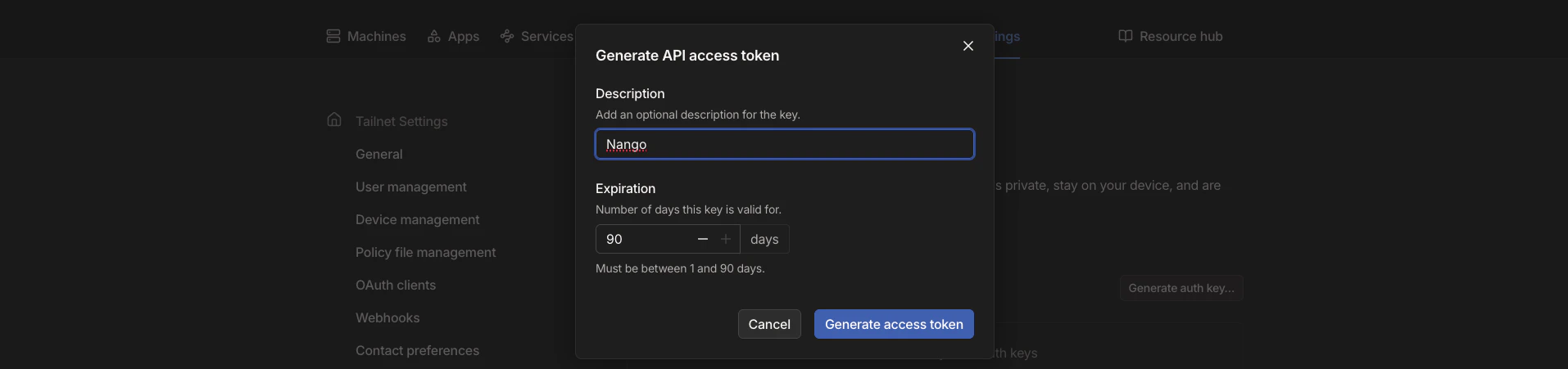 - API Access Token - A key that grants Nango permission to interact with Tailscale’s API resources and services.