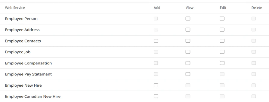 - In the Web Services table, assign the appropriate permissions for the API resources you need to access