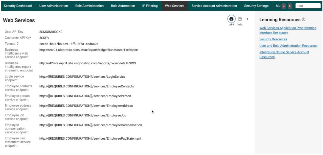 - The full service URL might look like “https://servicet.ultipro.com/services/”