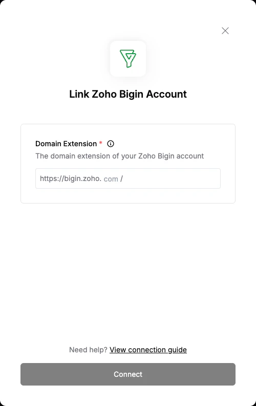 To authenticate with Zoho Bigin, you need:- Domain Extension - This extension indicates the data center where your account is hosted.